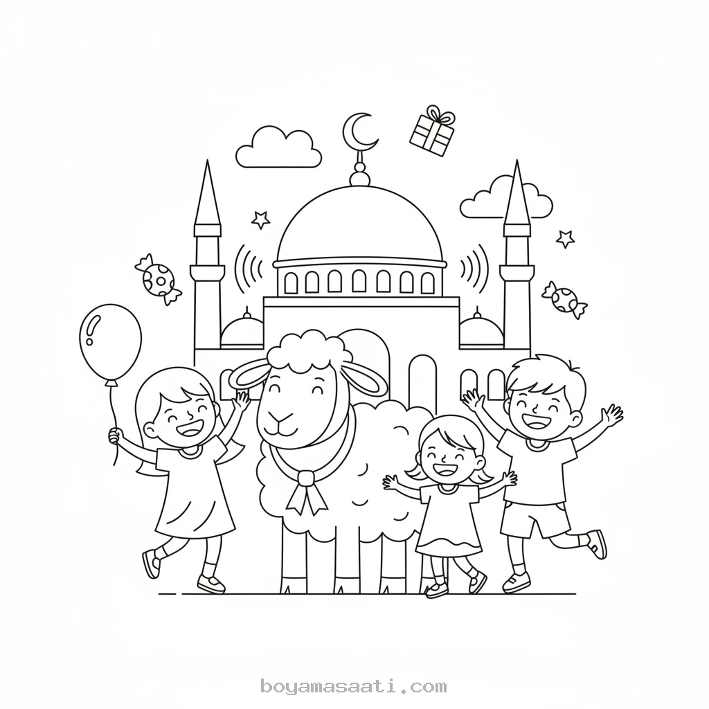 Kurban Bayramı Coşkusunu Yaşayan Çocuklar Boyama Sayfası