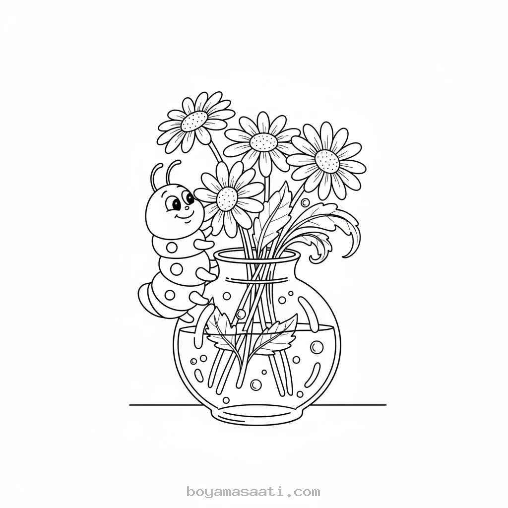 Meraklı Tırtılın Vazoyu Keşfettiği Boyama Sayfası