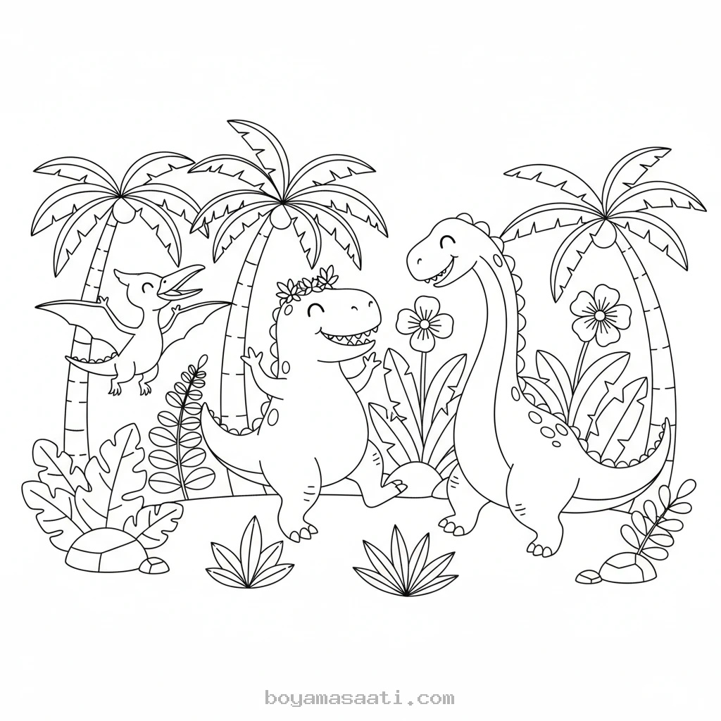 Tropik Ormanda Dans Eden Dinozorlar Boyama Sayfası