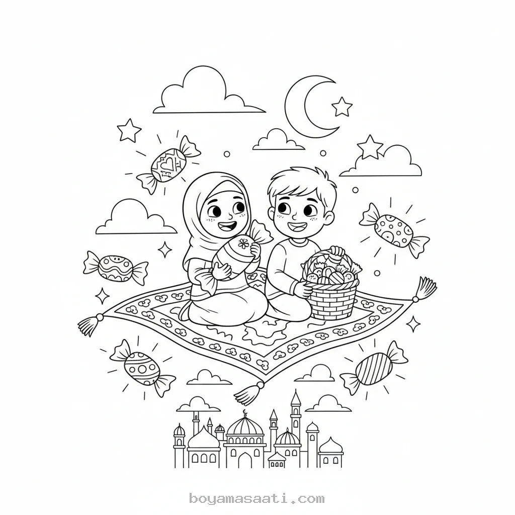 Uçan Halıyla Bayram Şekeri Toplayan Çocuk Boyama Sayfası
