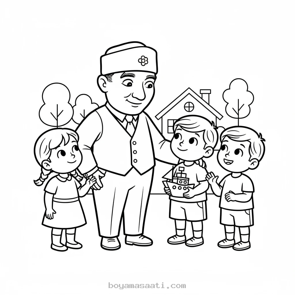 Şimdi çocuklarınızın bu anlamlı sayfayı renklendirirken eğlenmesini sağlayın. Hem evde hem de sınıfta kullanıma uygun olan bu Atatürk çocuklarla konuşuyor boyama sayfası, öğrenmeyi keyifli bir maceraya dönüştürür. Çocuğunuzun hayal gücünü kullanarak bu tarihi anı kendi renkleriyle canlandırmasına izin verin. Hemen indirin ve minik ellerin yaratıcılığını serbest bırakın!