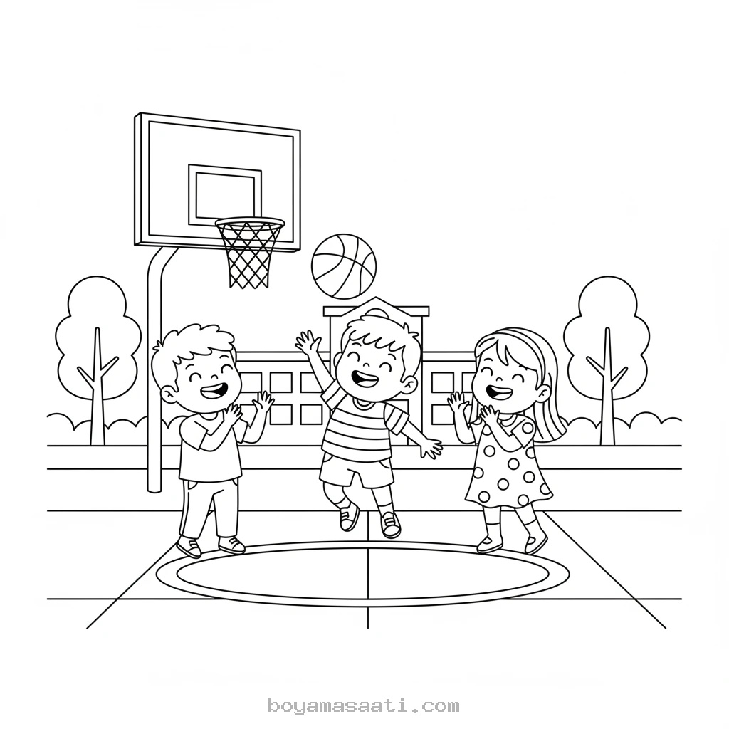 Çocuklarınız için hareketli ve eğlenceli bir aktivite arıyorsanız, okul bahçesinde basketbol oynayan çocuk boyama sayfası tam size göre! Bu ücretsiz ve yazdırılabilir sayfa, miniklerin spor sevgisini pekiştirirken, hayal güçlerini de geliştirmelerine olanak tanır. Çocuklar pota ve top detaylarını renklendirirken keyifli vakit geçirecekler.