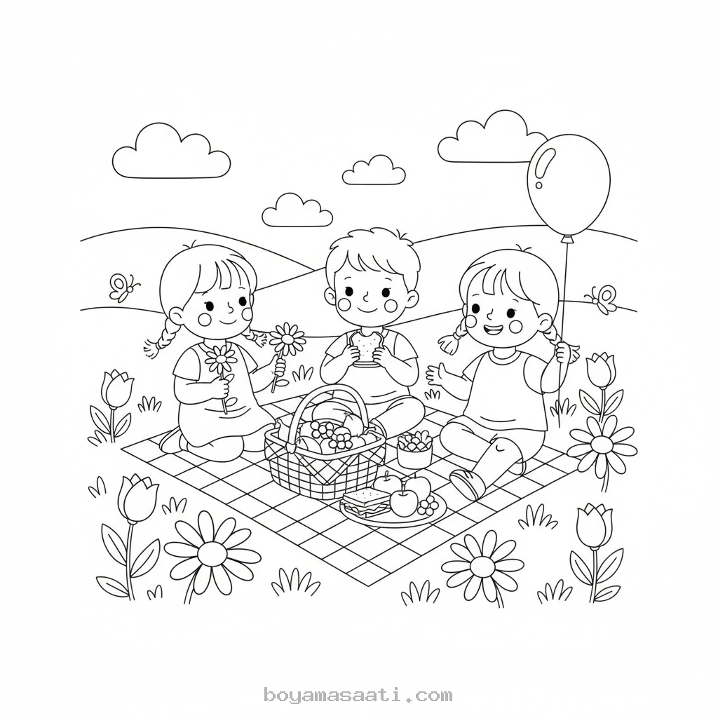 Çiçek Tarlasında Piknik Yapan Çocuk Boyama Sayfası