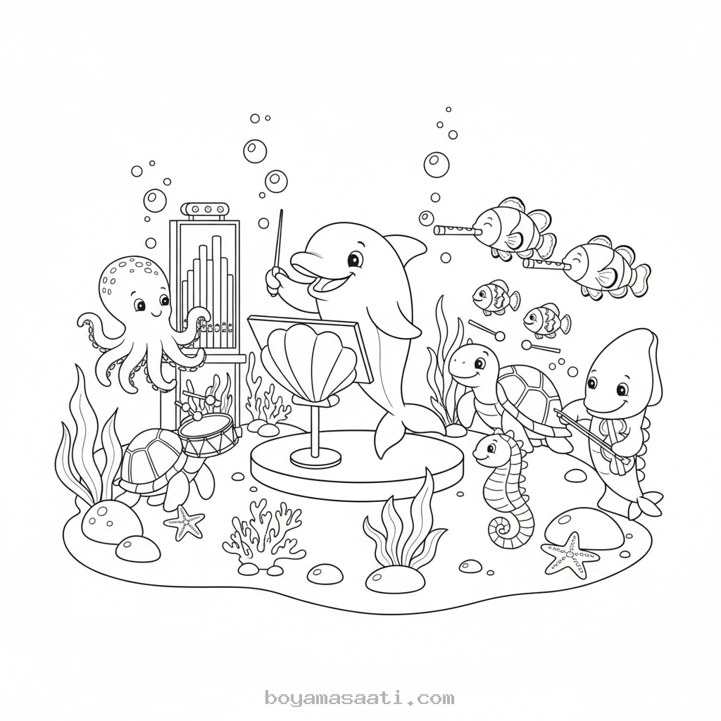 Denizaltı Orkestrasında Müzik Yapan Hayvanlar Boyama Sayfası