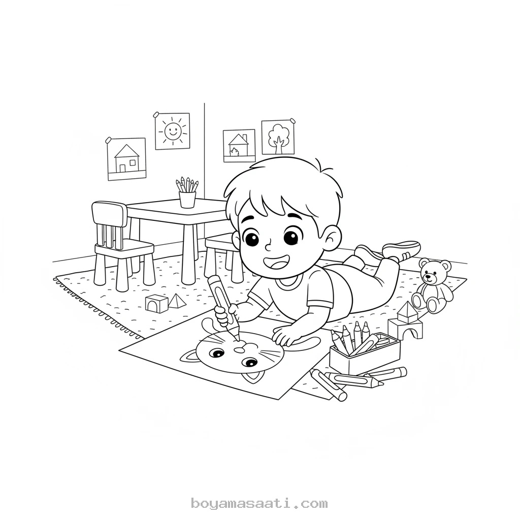 Evde Çizim Yapan Çocuk Boyama Sayfası