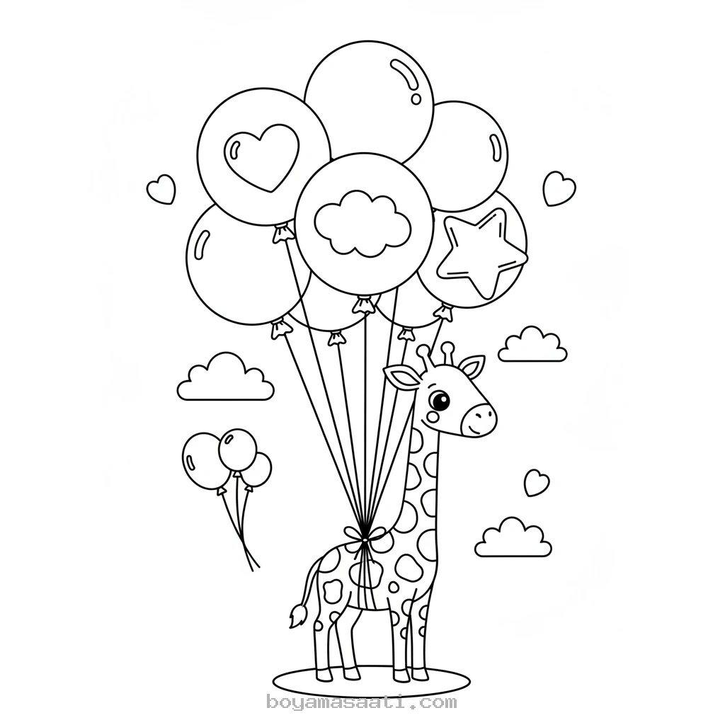 Çocuklarınızın hayal gücünü gökyüzüne taşıyacak bu harika zürafa boyama sayfası ile tanışın! Renkli balonlarla dans eden sevimli bir zürafa çizimi, miniklerin yaratıcılığını serbest bırakmak için idealdir. Özellikle okul öncesi ve ilkokul çağındaki çocuklar için tasarlanan bu eğitici etkinlik, renkleri tanıma ve kullanma becerilerini geliştirirken, onlara keyifli vakit geçirme fırsatı sunar. Oldukça kolay bir tasarıma sahip bu sayfa, küçük yaştaki çocukların da rahatlıkla tamamlayabileceği şekilde hazırlanmıştır.