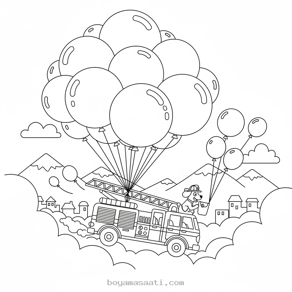 Uçan Balonlarla Yarışan İtfaiye Arabası Boyama Sayfası